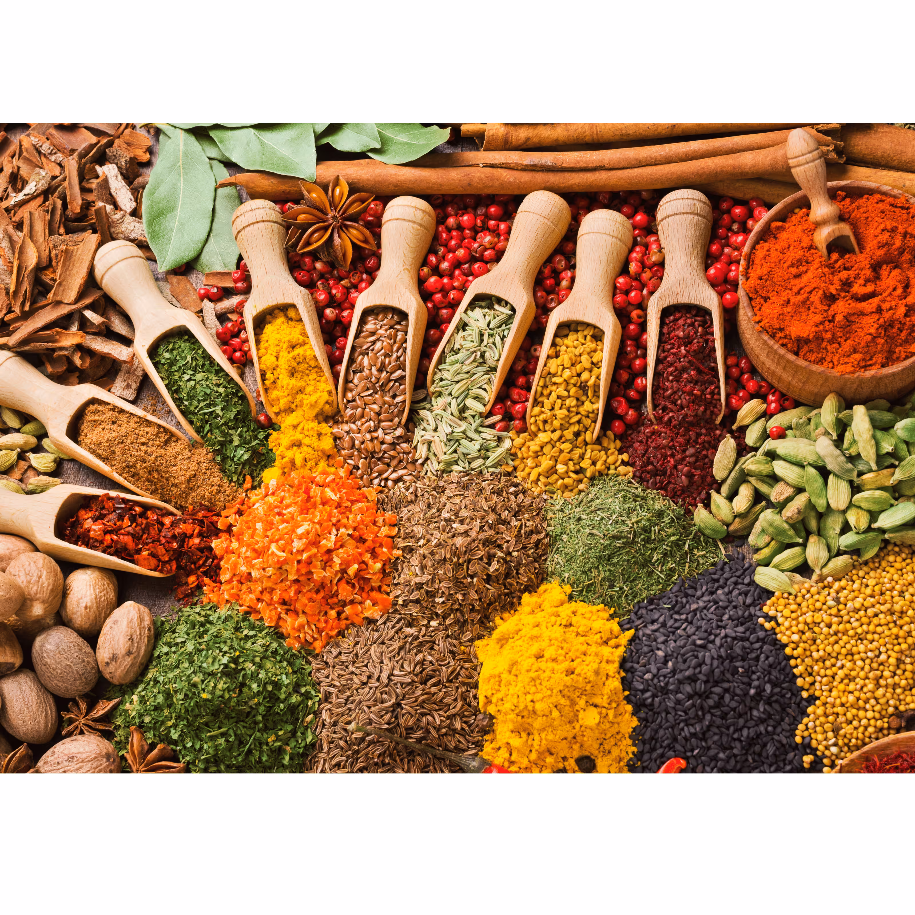 coriander, red chili, fenugreek, cardamom, and other whole or ground spices, packed for freshness